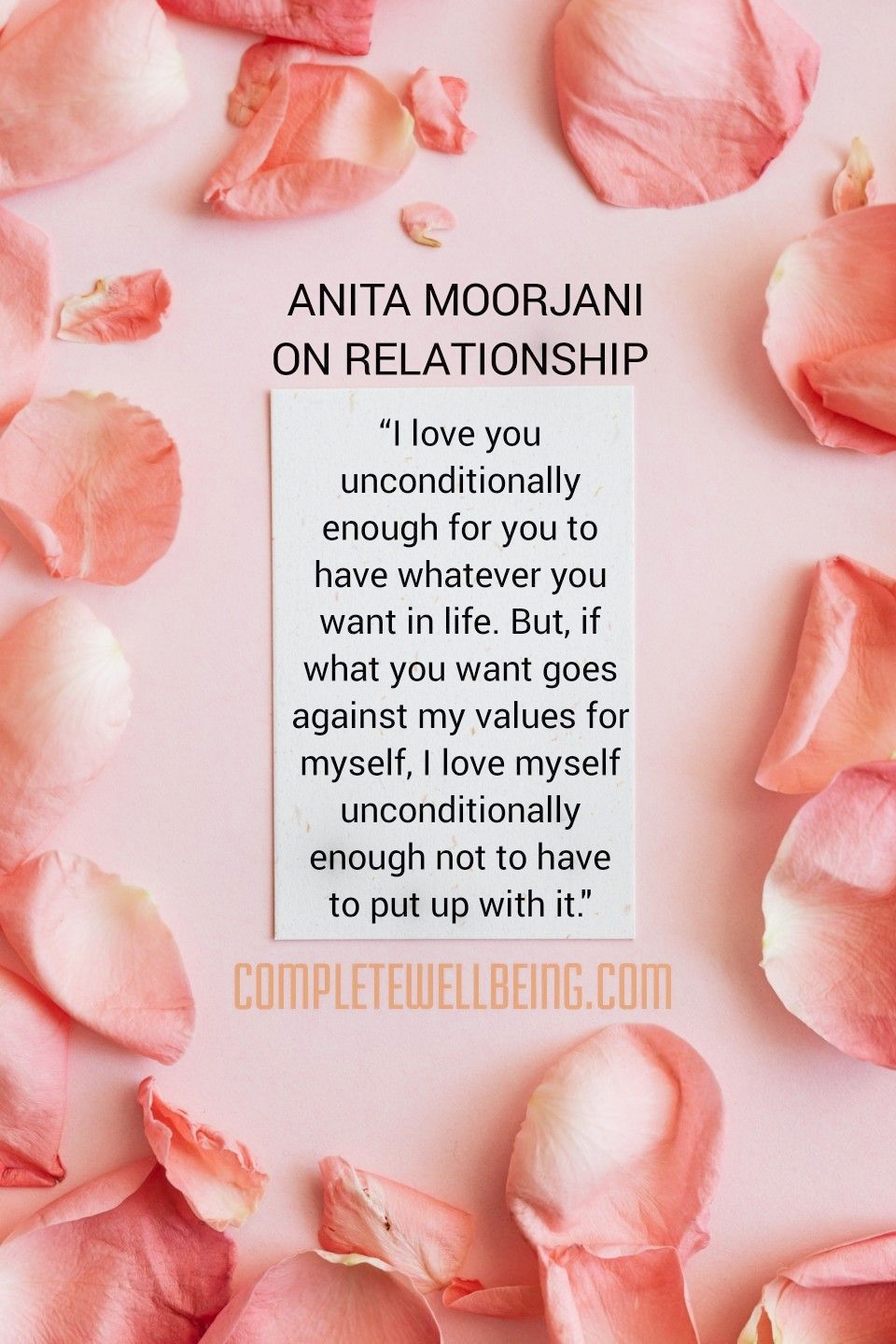 Anita Moorjani: When we learn to love ourselves unconditionally, we are able to love other people unconditionally. And if you are having an issue in your relationship, the conversation I would really like to see you have is something along the lines of saying to your partner, “I love you unconditionally enough for you to have whatever you want in life. But, if what you want goes against my values for myself, I love myself unconditionally enough not to have to put up with it.” In other words, in regular love as we tend to practise in physical life, we tend to place conditions, we tend to have contracts like marital contracts and we expect people to stand by the contracts, whether they feel love for us or not. Unconditional love is when you love somebody so much that what you want for them is for them to have what they want for themselves. And when what they want for themselves is not quite what you want in the relationship, unconditional love for yourself allows you to leave the relationship. And if that person doesn’t want to lose you, if they love you and want to give you what you want, they will stay in the relationship, but it will be a much more real relationship than a conditional one where two people are doing it out of obligation.